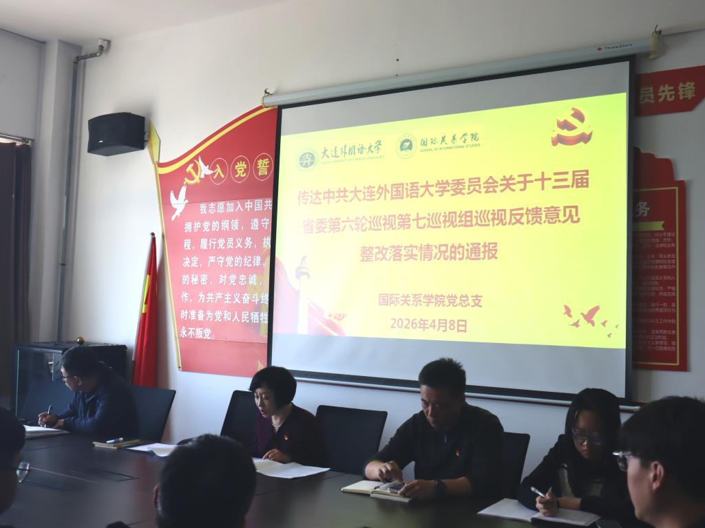 党日活动中,郝利群对中共大连外国语大学委员会关于十三届省委第六轮巡视第七巡视组巡视反馈意见整改落实情况进行传达。要求全体党员提高政治站位,坚定初心使命,推动学校事业高质量发展。