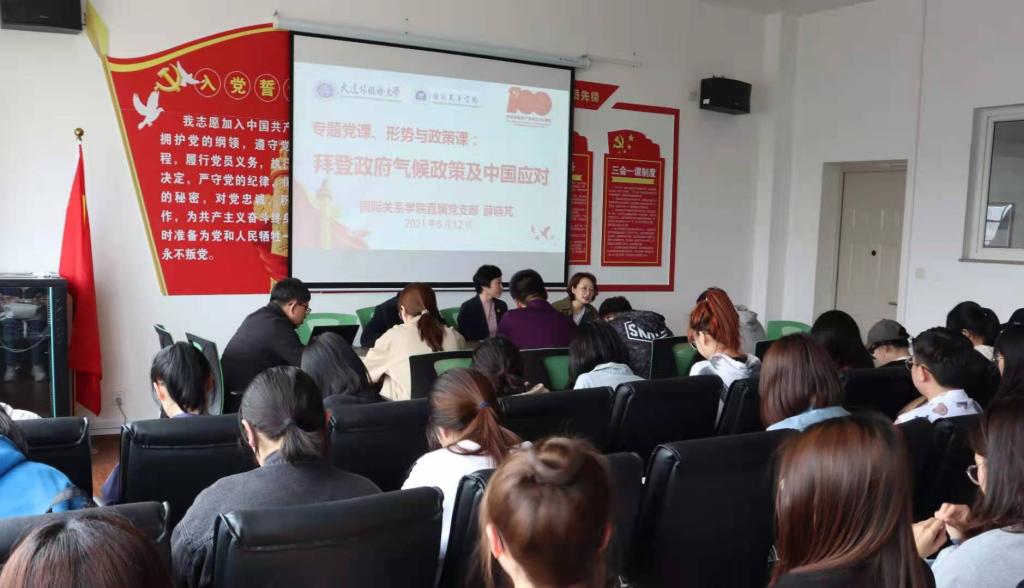 随后,薛晓芃院长以《拜登政府的气候政策及中国应对》为题上专题党课、形势政策课,多角度分析了拜登政府执政之后关于气候议题的政策走向,深入探究了中美两国就全球气候问题在双边、多边领域合作中面临的机遇和挑战。分团委书记侯培岩带领支部党员和入党积极分子共同学习了习近平总书记在全国脱贫攻坚总结表彰大会上的重要讲话。